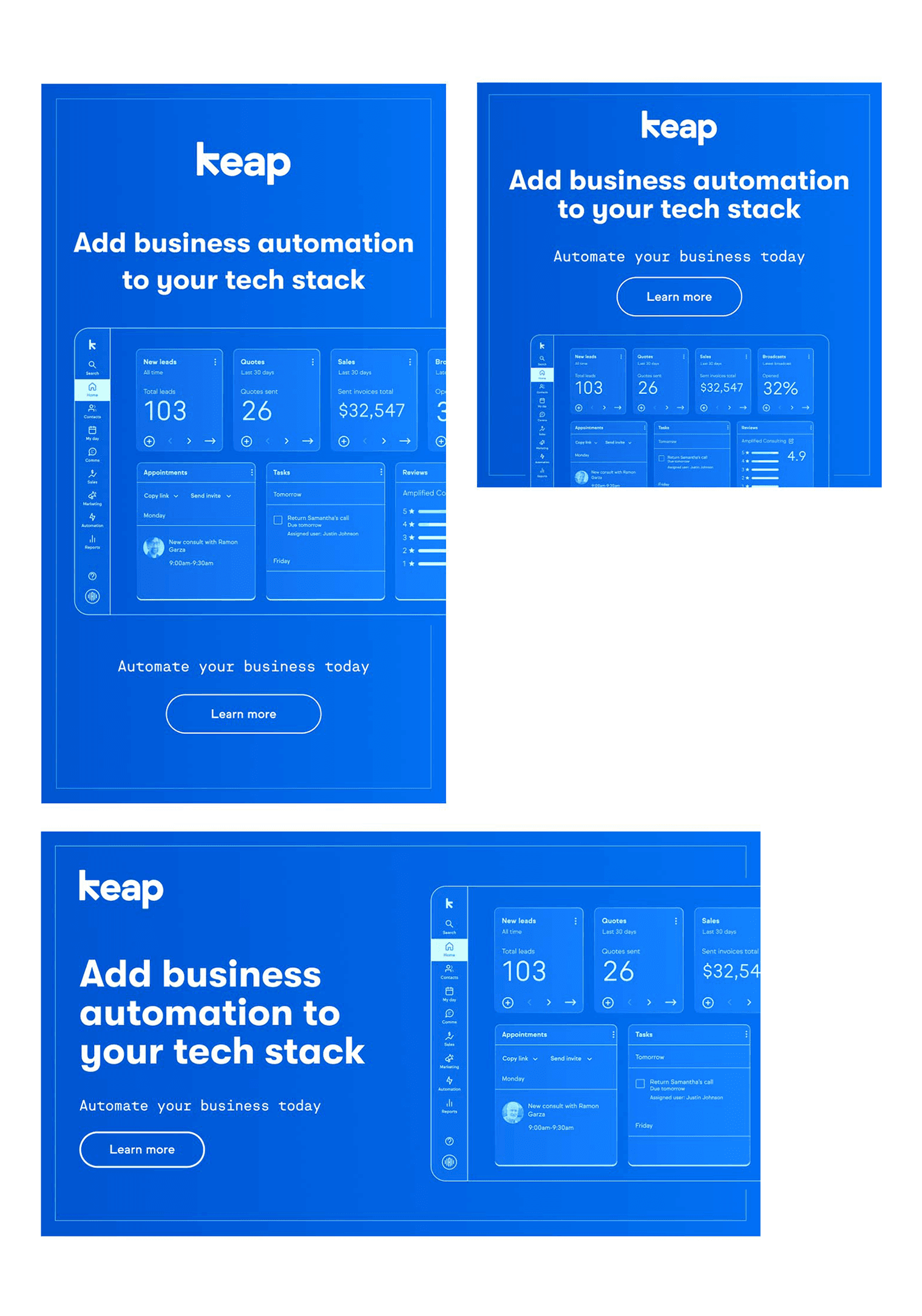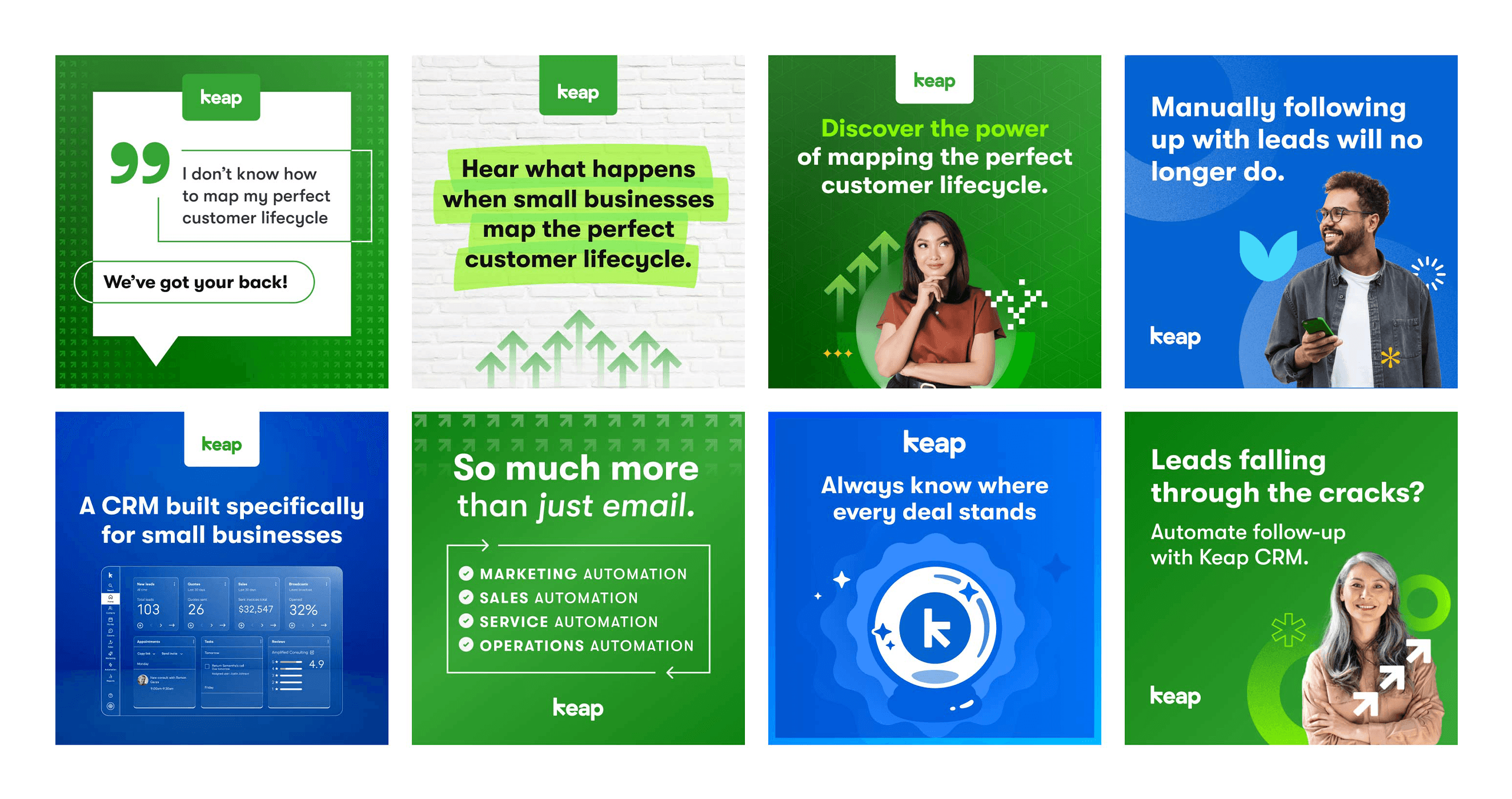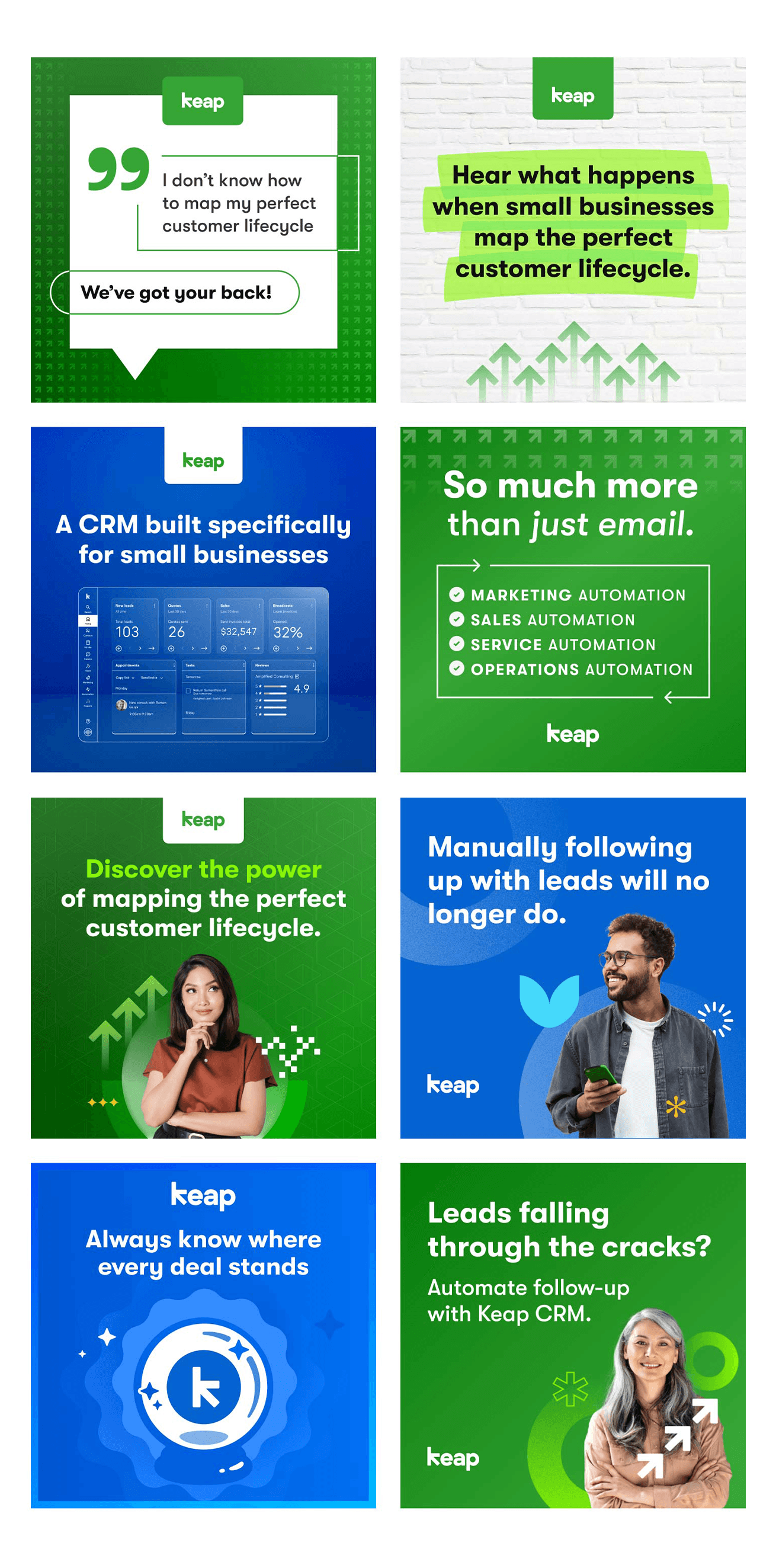 Designing ad campaigns and social media graphics for Keap means creating visuals that simplify complex SaaS features while staying true to a clean, approachable brand. Each piece must quickly capture attention, communicate value, and resonate with small business owners. The goal is to make automation and CRM tools feel accessible, useful, and worth exploring—all while supporting Keap’s broader marketing strategy.