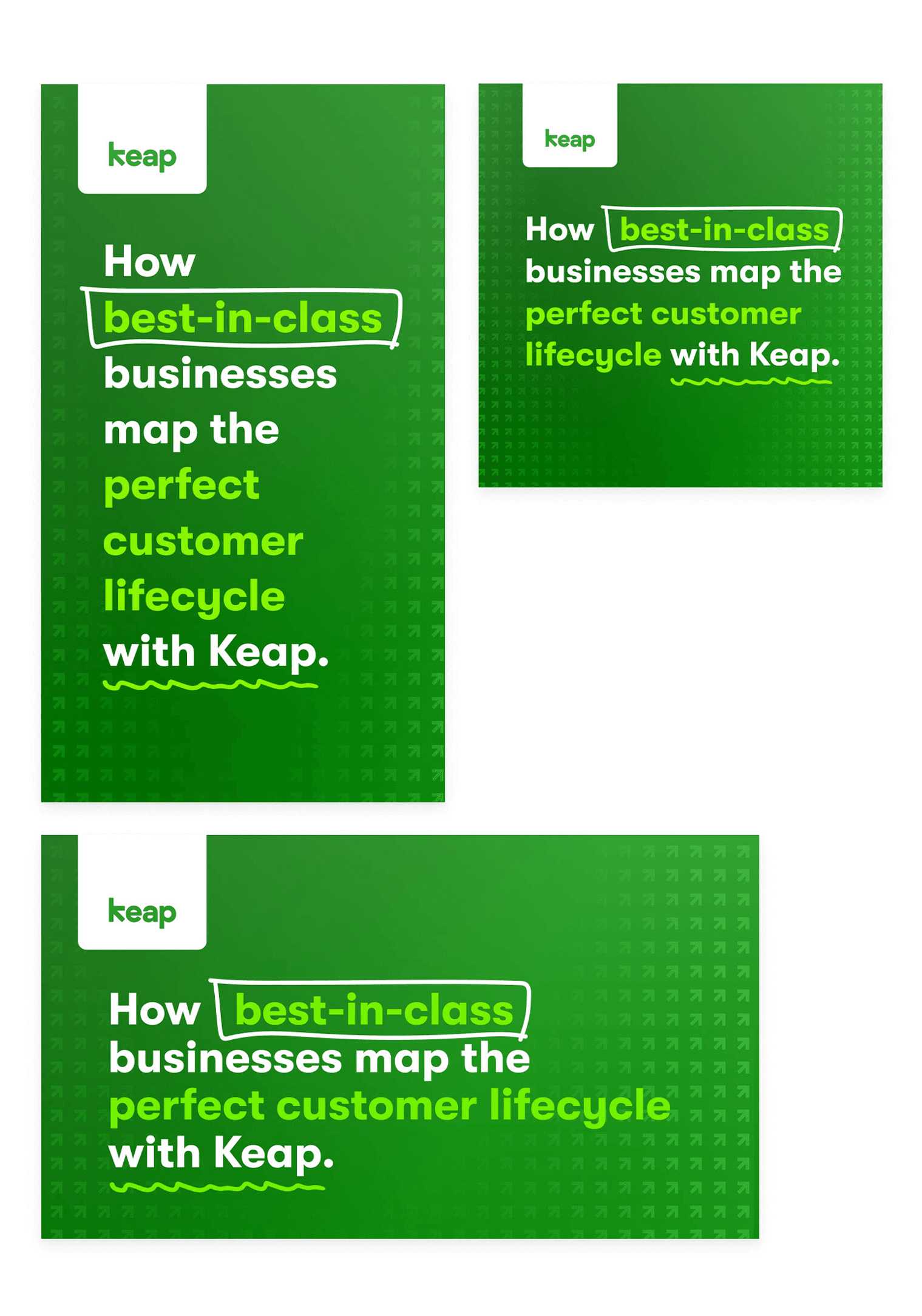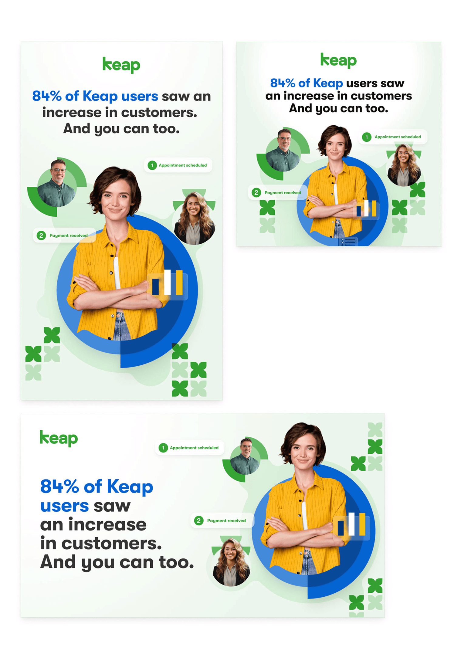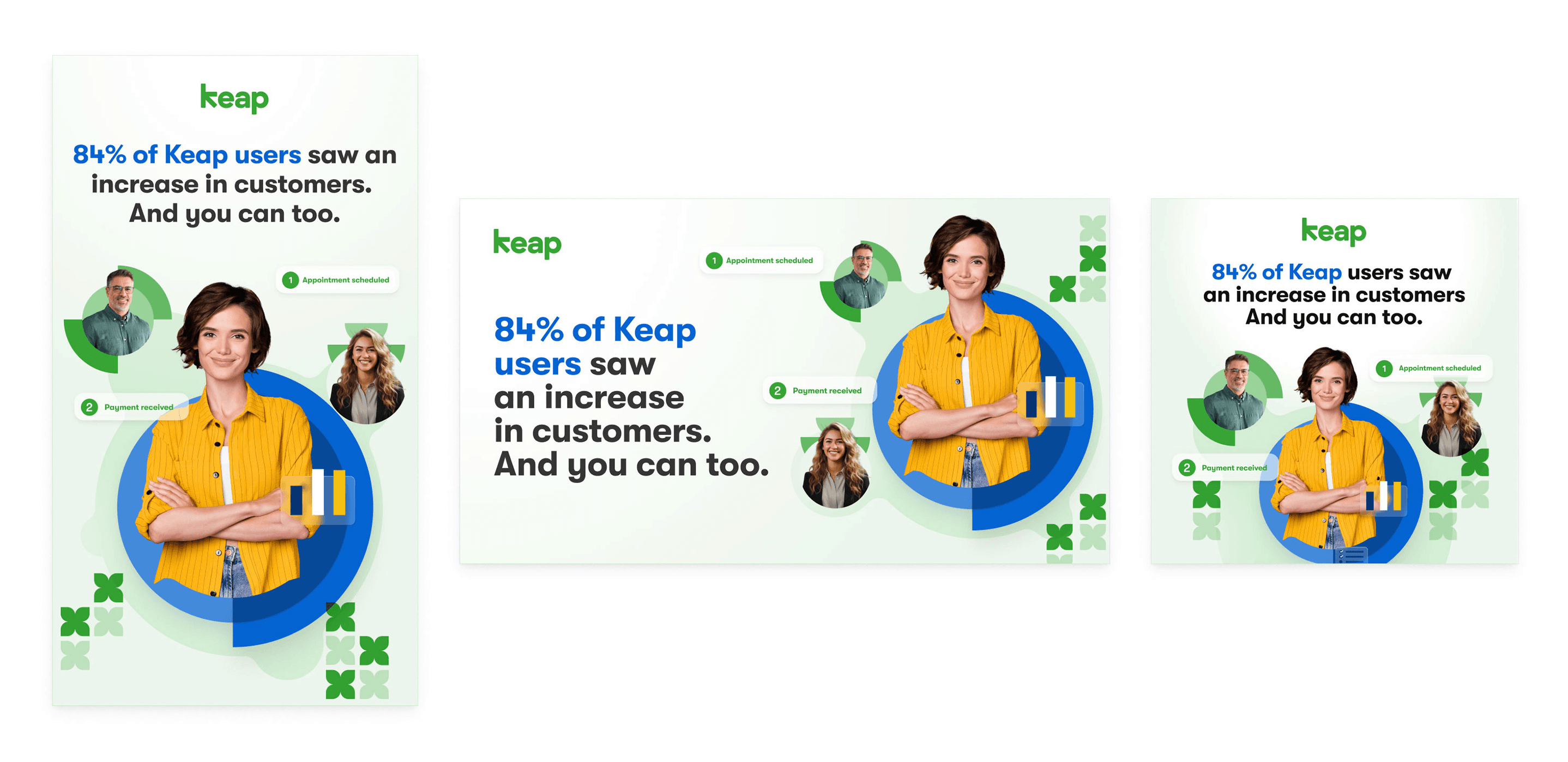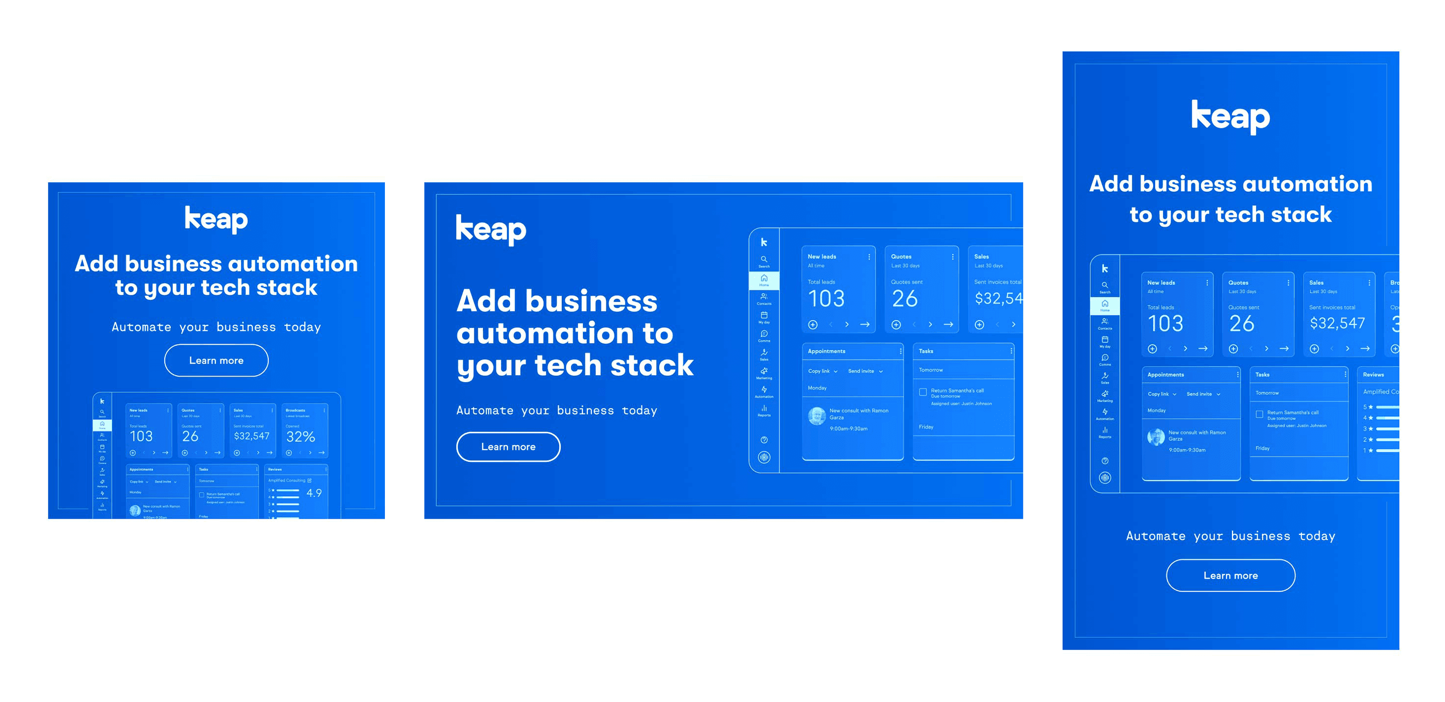 Designing ad campaigns and social media graphics for Keap means creating visuals that simplify complex SaaS features while staying true to a clean, approachable brand. Each piece must quickly capture attention, communicate value, and resonate with small business owners. The goal is to make automation and CRM tools feel accessible, useful, and worth exploring—all while supporting Keap’s broader marketing strategy.